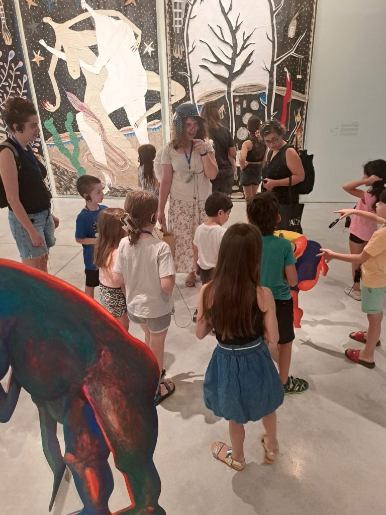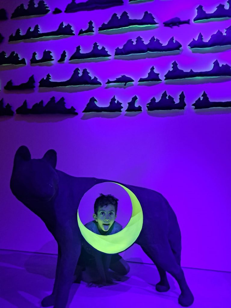 בתוך טווח קשב של כ-45 דקות עברנו שלוש קומות עם שלל מיצגים, תמונות, ציורים, פסלים ומיצגי מולטימדיה ובינה מלאכותית. כאן אני הייתי צריכה לשחרר כי אני אוהבת לעבור על כל העבודות והסיור המודרך יותר אינטואיטיבי. נסחפתי גם בעקבות תשומת הלב של אוריאן ויחד סטינו קצת גם מהסיור המוגדר כדי להתעכב על משהו שאהבנו. תוך כדי התנסנו גם בצילום ובפרספקטיבה, בפתרון כתב סתרים ובחידות. אחרי הסיור הרשמי חזרנו לעוד סיור עצמאי ושיחקנו קצת במדרגות. זה היה אישור לכך שהמבנה (שהוא יצירת אמנות בפני עצמה) והתערוכה הצליחו ללכוד אותנו בקסמם ולחבר בינינו חזק. איזה תענוג והכרת תודה.