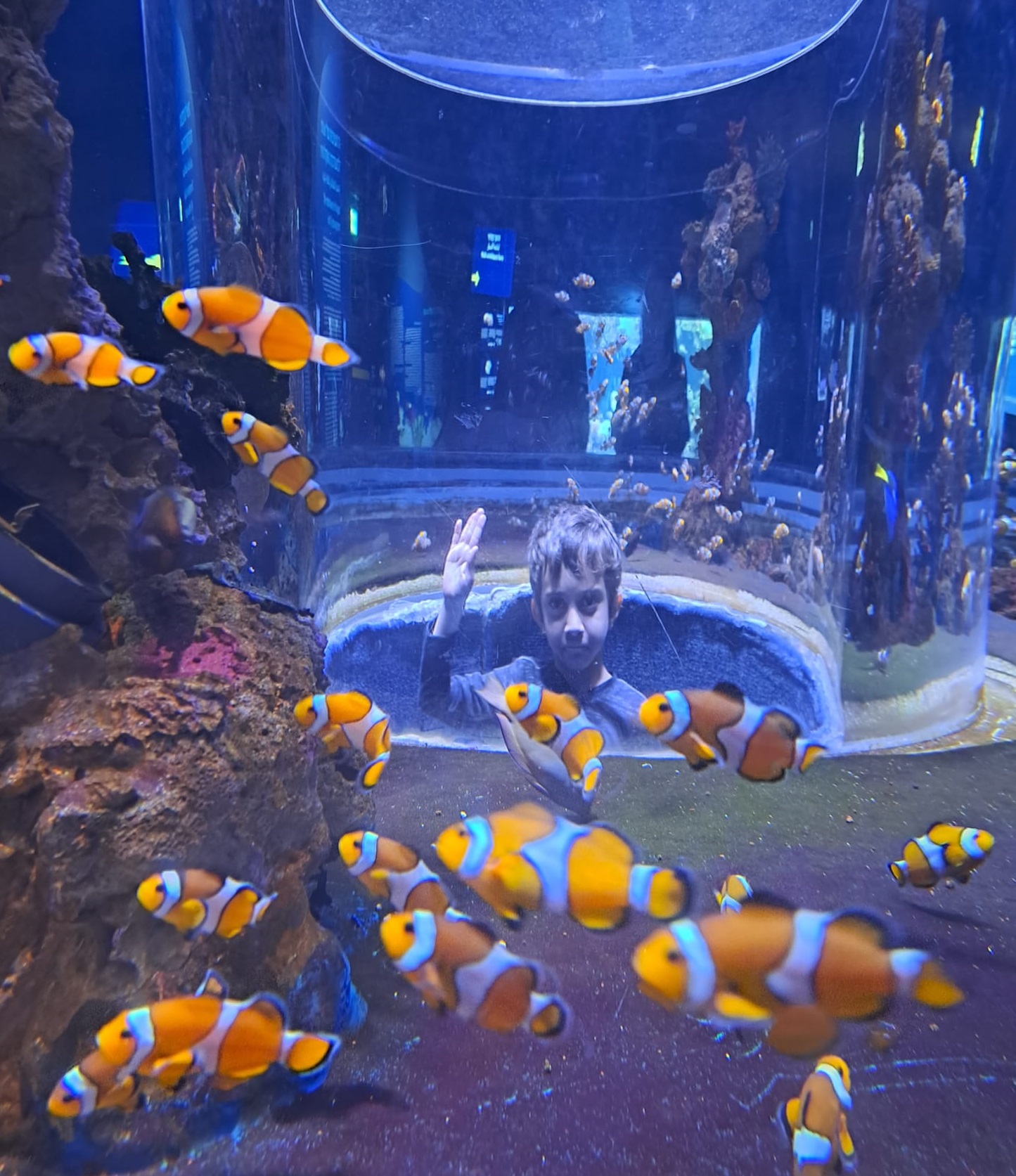 בתוך האקווריום עצמו חשוך ושקט, מתאים מאוד לאנשים שצריכים רגע ניתוק מהמציאות וצלילה לתוך עולם מרגיע, שזה בעצם כולנו, בכל זמן נתון, ובטח בירושלים. אסור לצלם כאן עם פלאש כי זה מזיק לעיני הדגים, ויש מדי חמש דקות הדרכות קוליות בתצוגת הים הפתוח ובאווירת ספינות טרופות. יש גם מיכלי ענק שמקיפים אותך מכל עבר עד שמופיע השחקן הראשי ואז השקט נקטע בזעקות "אמא כריש, תצלמי את הכריש אמא, תראי הוא מתקרב, אמא את רואה את הכריש?"